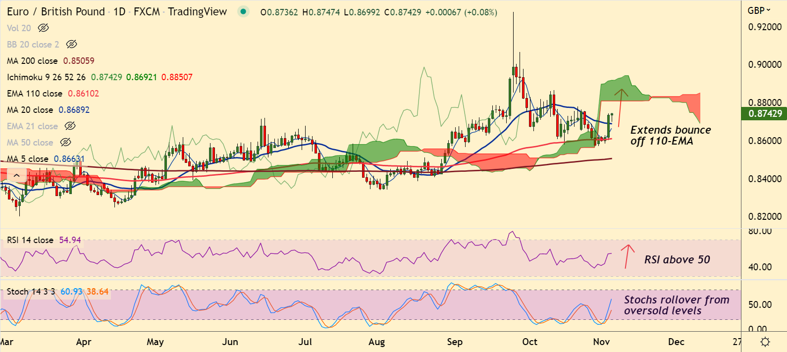 Summary: EUR/GBP has found strong support at 110-EMA. The pair has edged above 21-EMA, scope for further upside.