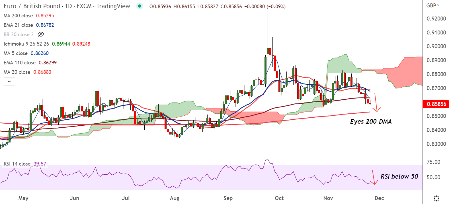 Summary: EUR/GBP trades with a bearish bias. Scope for test of 200-DMA at 0.8529.