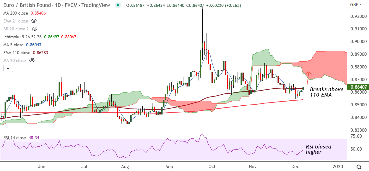 Summary: EUR/GBP has edged above 110-EMA which was capping upside from the past few session. Watch out for close above for further upside.