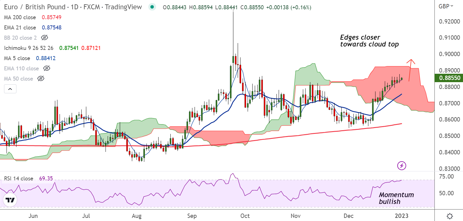 Summary: EUR/GBP is showing signs of exhaustion. Overbought oscillators likely to cause some pullback. Major trend remains bullish. Bullish invalidation only below 21-EMA. Resumption of upside is likely to take the pair higher to test cloud top.
