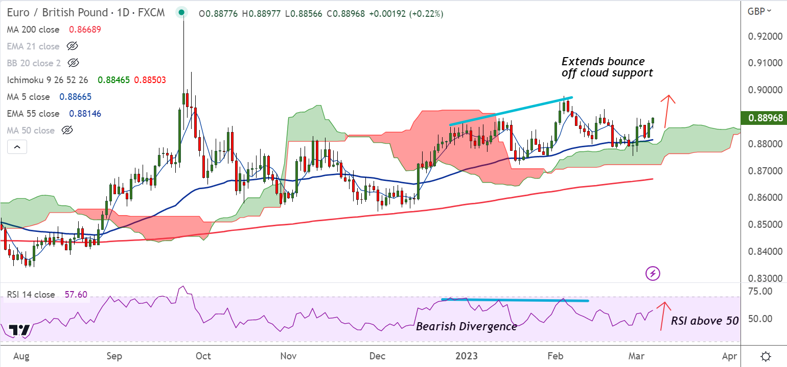 Summary: EUR/GBP was trading with a bullish bias. Weakness only below daily cloud.