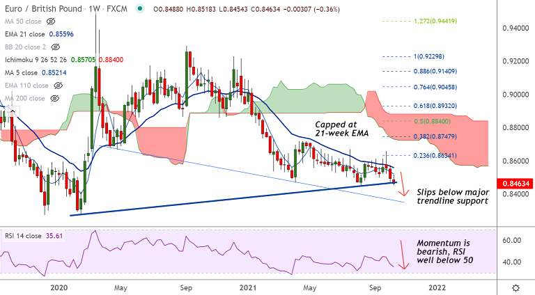 Summary: EUR/GBP hovers around major trendline support at 0.8465. Watch out for weekly close below for further weakness. Breach below sees little support till 0.8365.