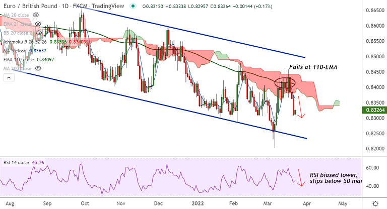 Summary: EUR/GBP recovery lacks traction. Technical bias has turned bearish after rejection at 110-EMA. Bias remains bearish, scope for dip till channel base at 0.8240.