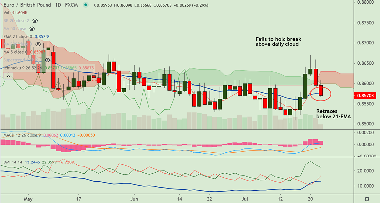 The pair has failed to extend cloud breakout, finds rejection at 110-EMA resistance.