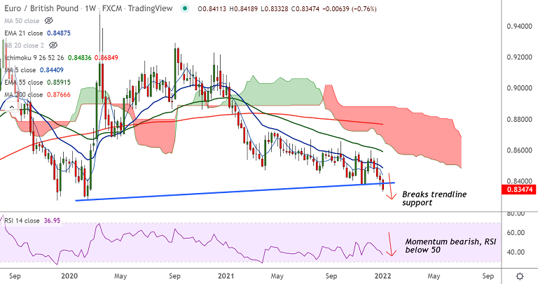 Summary: EUR/GBP break below major trendline support has opened downside. Further weakness on cards. Dip till 0.83 likely.