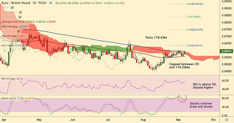 Support - 0.8557 (55-EMA), Resistance - 0.8593 (110-EMA)