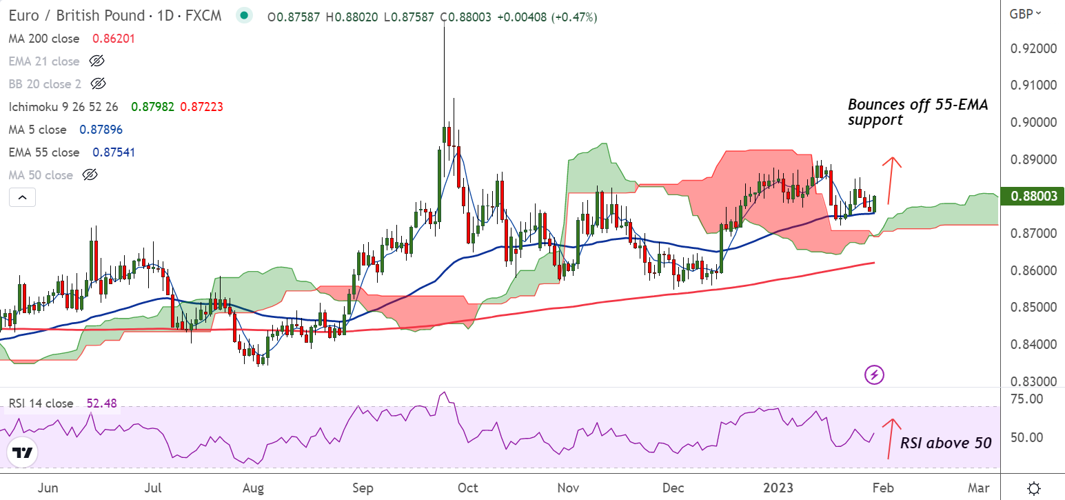 Summary: EUR/GBP bounces off 55-EMA support, but upside lacks conviction. 20-DMA offers stiff resistance at 0.8802, decisive break above will change near-term dynamics to bullish.