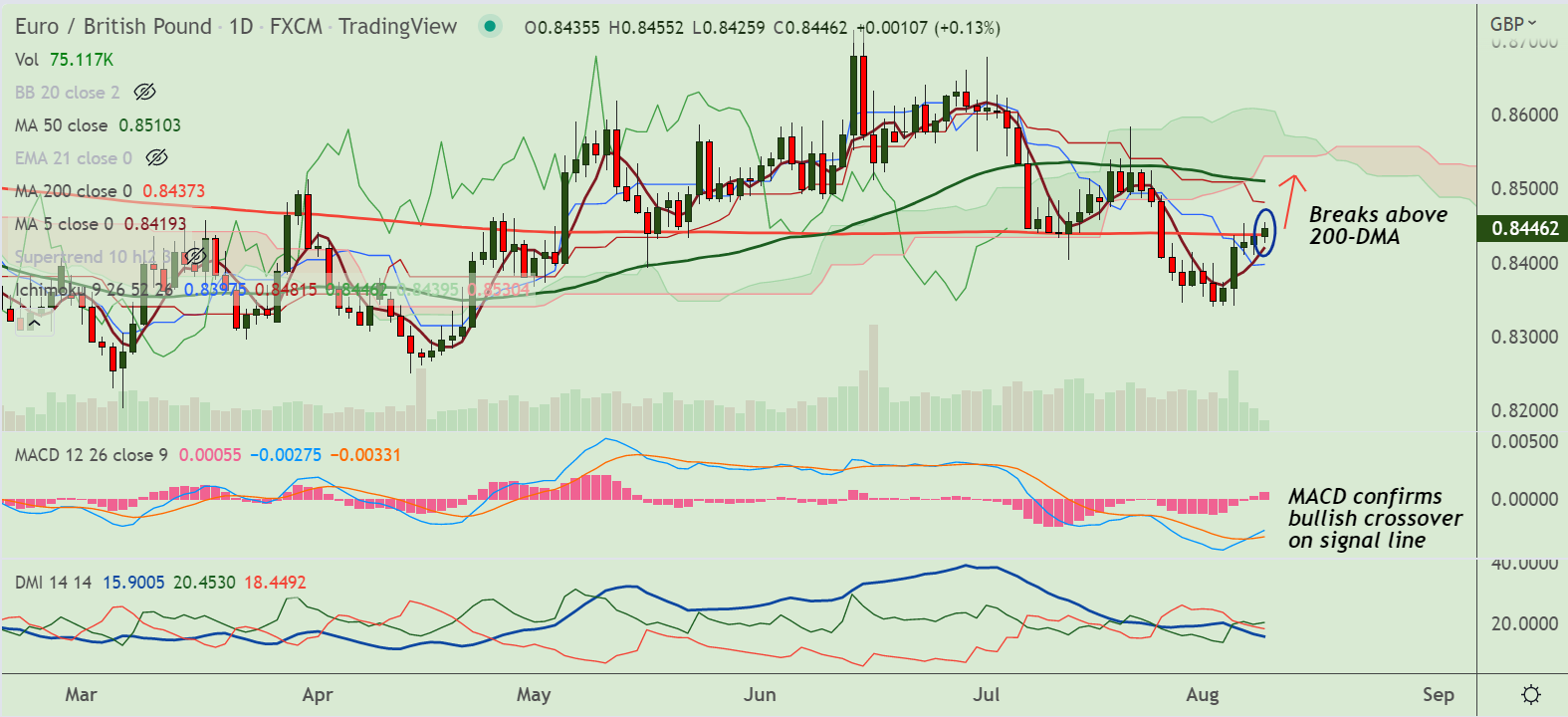 - EUR/GBP has broken above 200-DMA, poised for further upside