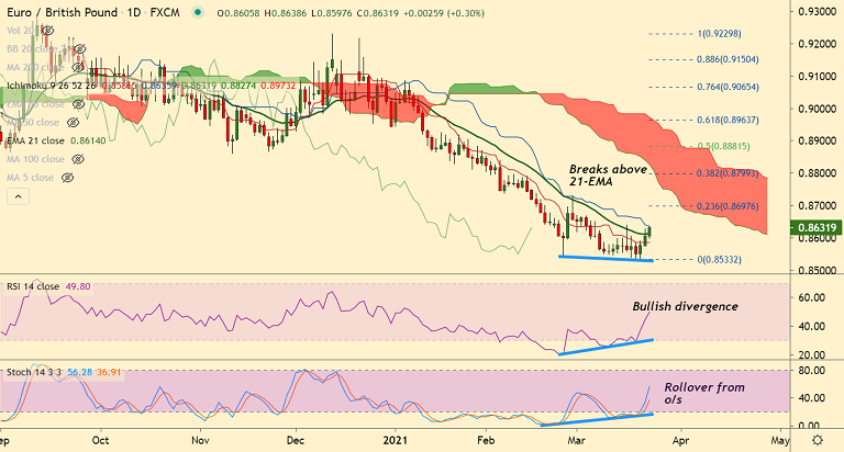 EUR/GBP set for further gains as price action breaks above 21-EMA. Major trend still remains bearish. Doji on the previous week's candle raises scope for further gains. Next bull target lies at 23.6% Fib at 0.8697.