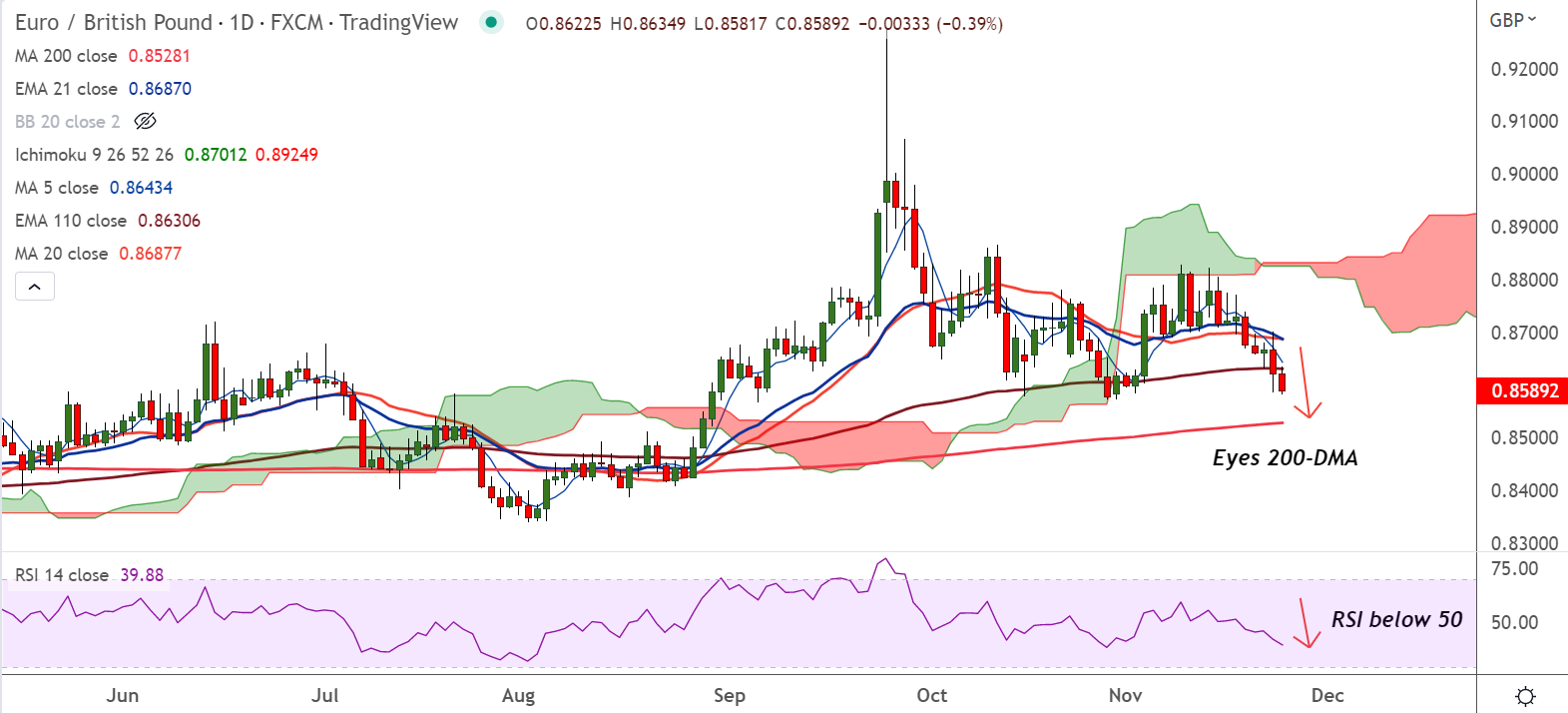 Technical bias for the pair has turned bearish after breach at 110-EMA. EUR/GBP edges lower towards 200-DMA support at 0.8528.
