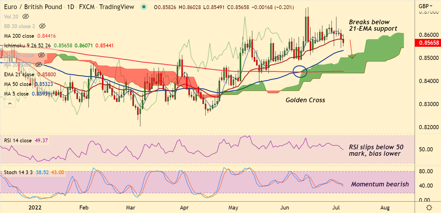 Summary: EUR/GBP slips below 21-EMA, outlook is bearish, 55-EMA at 0.8525 in sight.