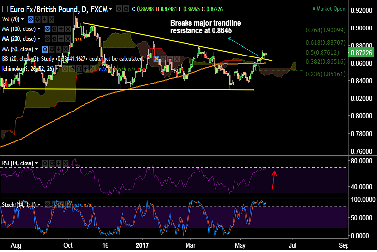 - The pair has broken above major trendline resistance at 0.8645. Technicals studies on weekly charts also support upside.