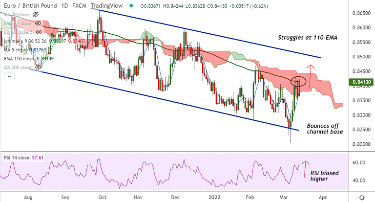 Summary: EUR/GBP finds stiff resistance at 110-EMA. Technical bias is bullish. However, break above required for upside continuation.