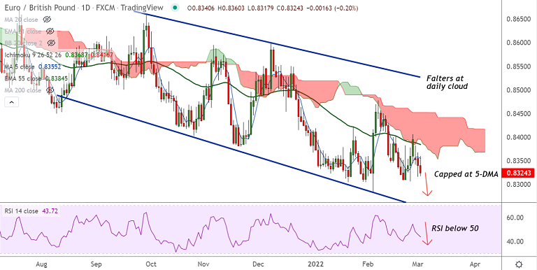The pair has slipped lower from session highs at 0.8360, upside is capped at 5-DMA resistance.