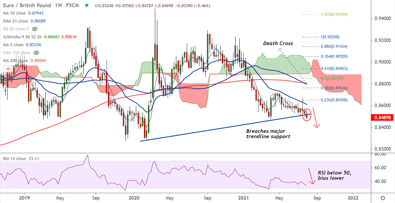 The pair has breached major trendline support at 0.8515, close below will accentuate downside.