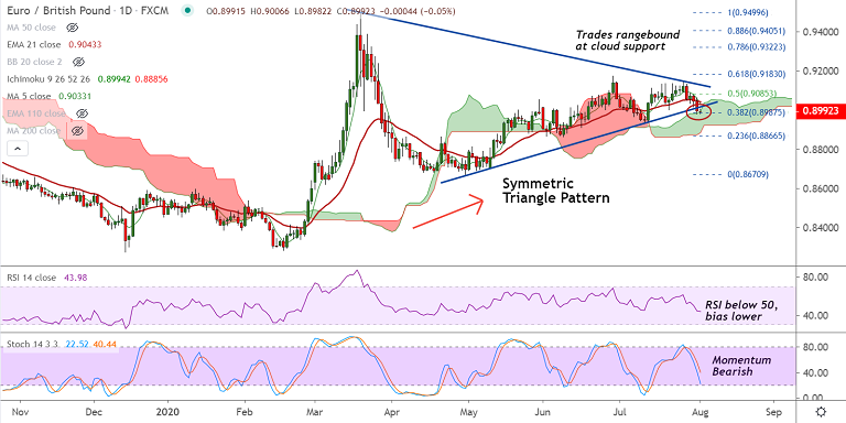 The pair was consolidating break below 'Symmetric Triangle' and hovers near cloud top which is offering strong support at 0.8994.