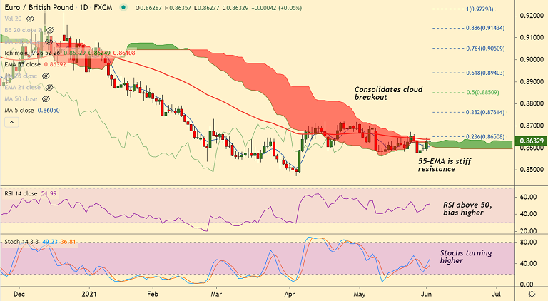 Summary: EUR/GBP is consolidating previous session's gains and cloud breakout, finds stiff resistance at 55-EMA at 0.8639. Break above 55-EMA will fuel further upside.