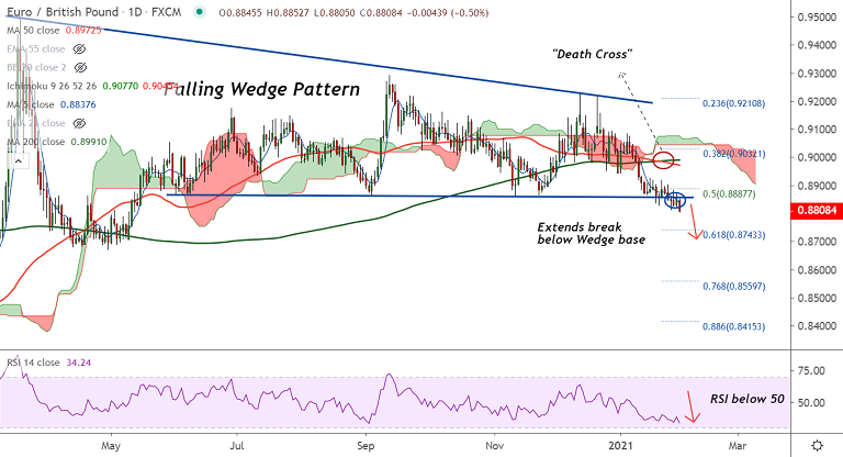 Technical bias for the pair has turned bearish after breach of Falling Wedge pattern, scope for further downside.