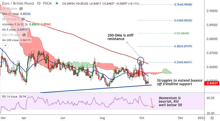 EUR/GBP has erased most of the day's gains and has slipped back into the red as bulls struggles to extend bounce off trendline support.