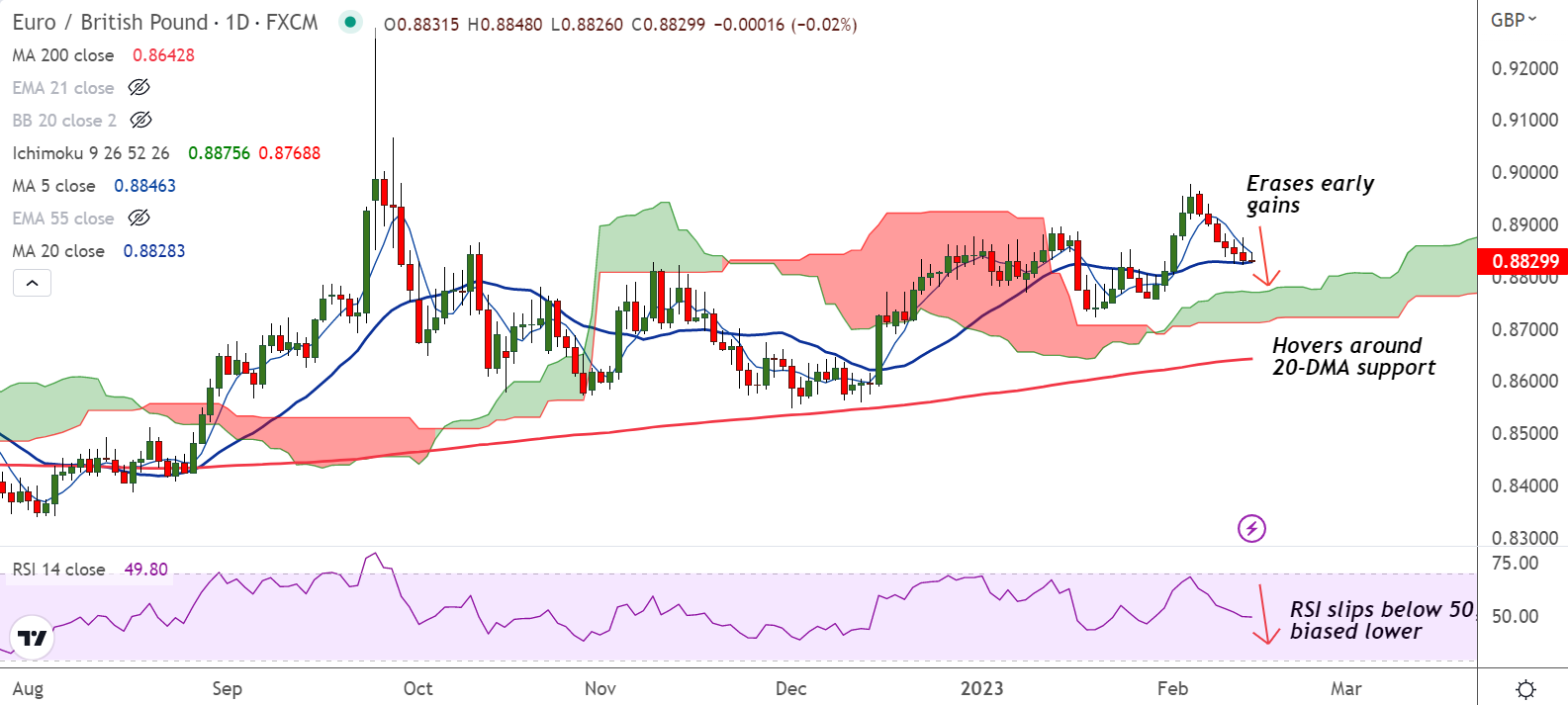 Summary: EUR/GBP finds immediate support at 20-DMA. Technical bias for the pair is bearish. Watch out for break below 20-DMA for more weakness. Test of daily cloud support at 0.8770 likely.