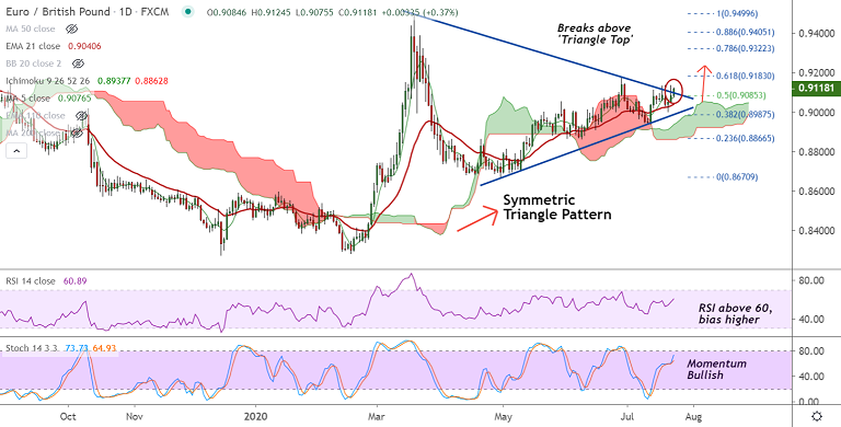 The pair has shown a break above 'Symmetric Triangle' pattern raising scope for further upside.