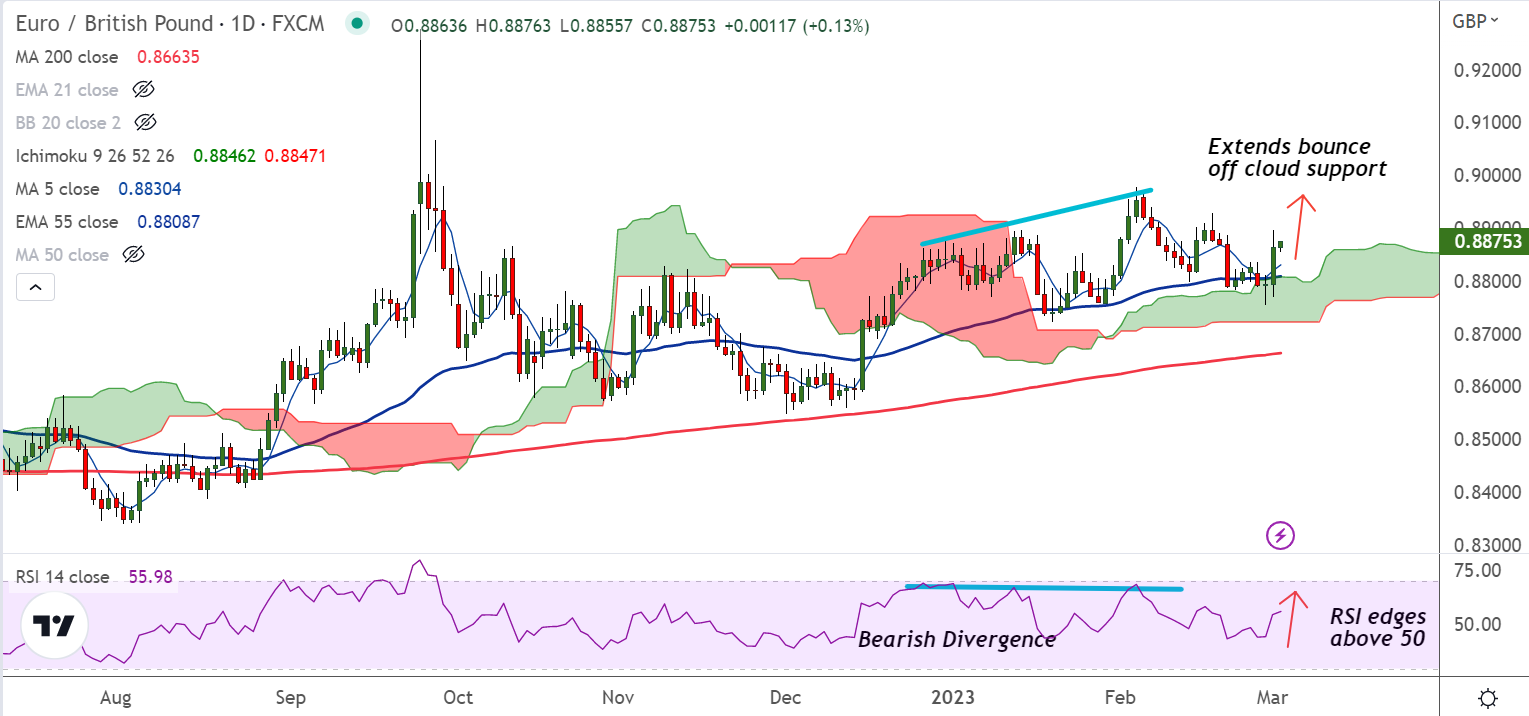 Summary: EUR/GBP has paused downside with Dragonfly Doji, price action has retraced above daily cloud. Technical indicators are turning bullish. The pair is poised for further upside.