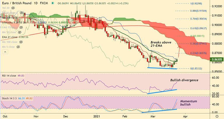 Summary: EUR/GBP is extending upside in the week after a Doji on the previous week's candle. Break above 21-EMA has reinforced upside for the pair. Bulls in the pair eye 23.6% Fib at 0.8697. Failure to close above 21-EMA negates upside bias.