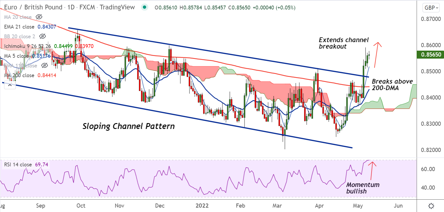 Technical indicators support further upside in the pair. Immediate resistance lies at 110-week EMA at 0.8591. Watch out for decisive break above for further gains.