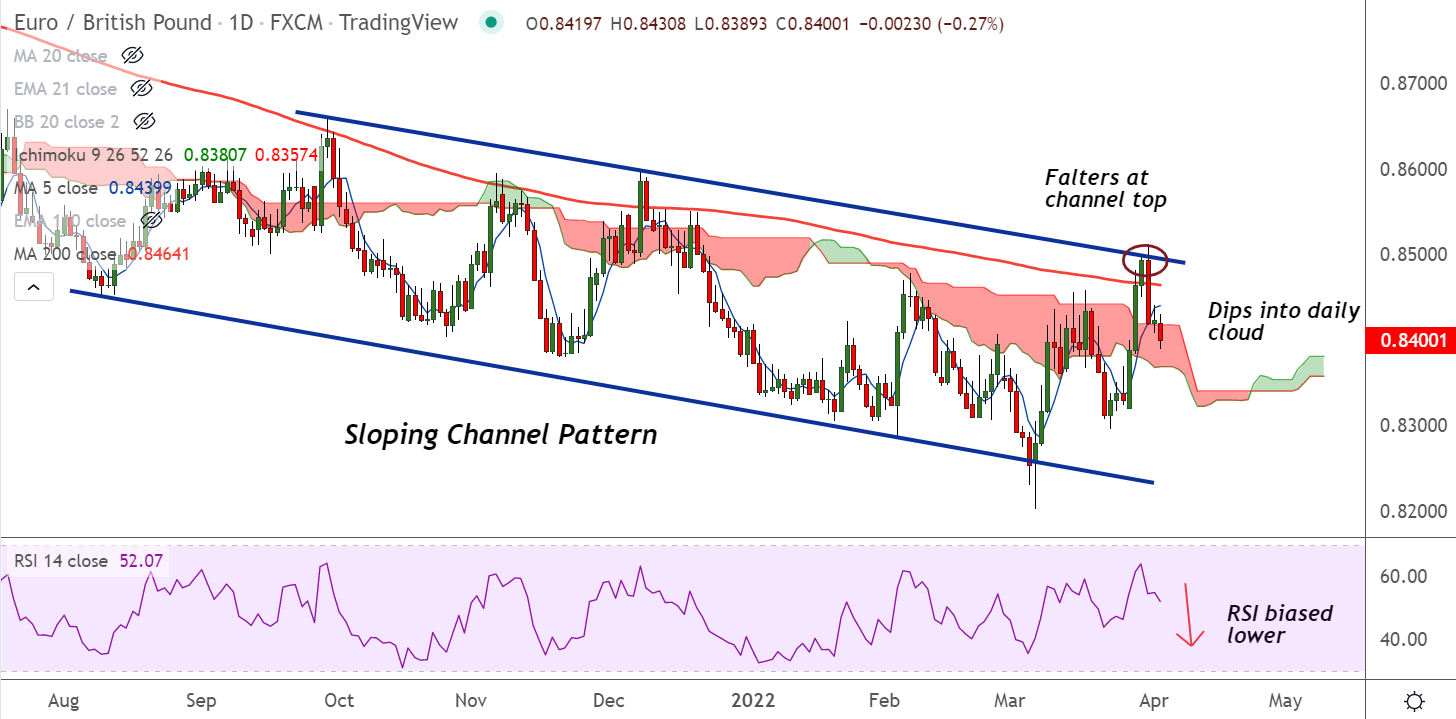 Summary: EUR/GBP is trading with a bearish bias. The pair is holding support at 200H MA and 21-EMA. Break below to plummet prices further.