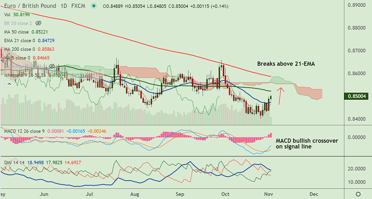 Summary: EUR/GBP poised for further upside. Break above 55-EMA will see test of 0.8522. Bullish invalidation only below 21-EMA.