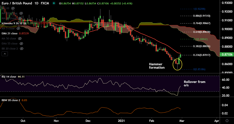 Summary: EUR/GBP shows signs of reversal. Break above 200H MA has raised scope for further upside. Hammer at lows adds to the bullish bias. 21-EMA is immediate resistance at 0.8724, break above will see test of 0.88 levels.