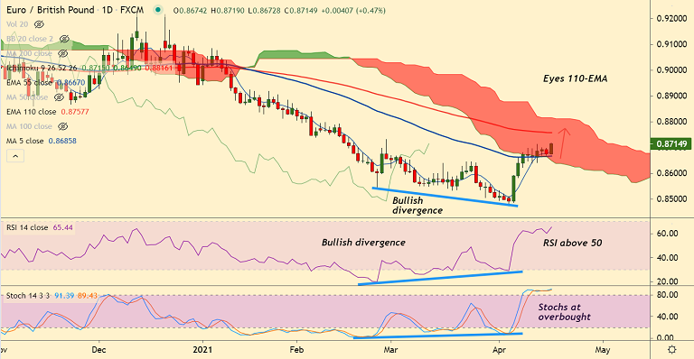 Next hurdle on the upside aligns at 110-EMA at 0.8757. Breakout there could see test of 200W MA at 0.8835.