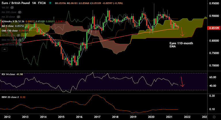 EUR/GBP bears eye 110-month EMA support at 0.8473. Break below will drive further weakness.