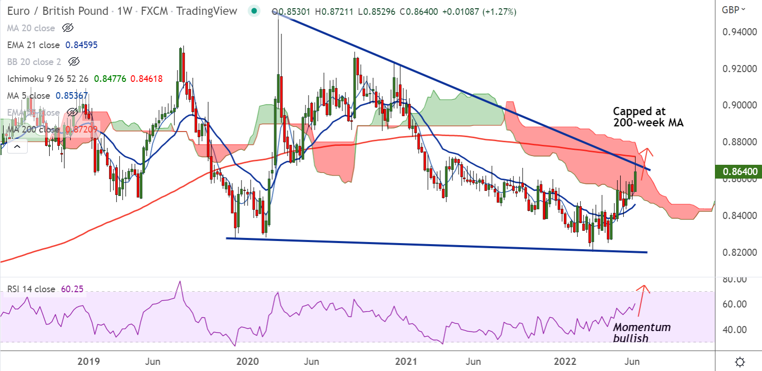 EUR/GBP trades with a bullish bias. 'Golden Cross' (Bullish 50-DMA crossover on 200-DMA) adds to the upside bias.