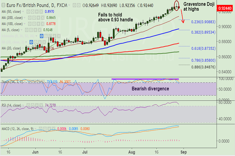 - EUR/GBP fails to hold above 0.93 handle, slips lower to trade at 0.9243 at the time of writing.