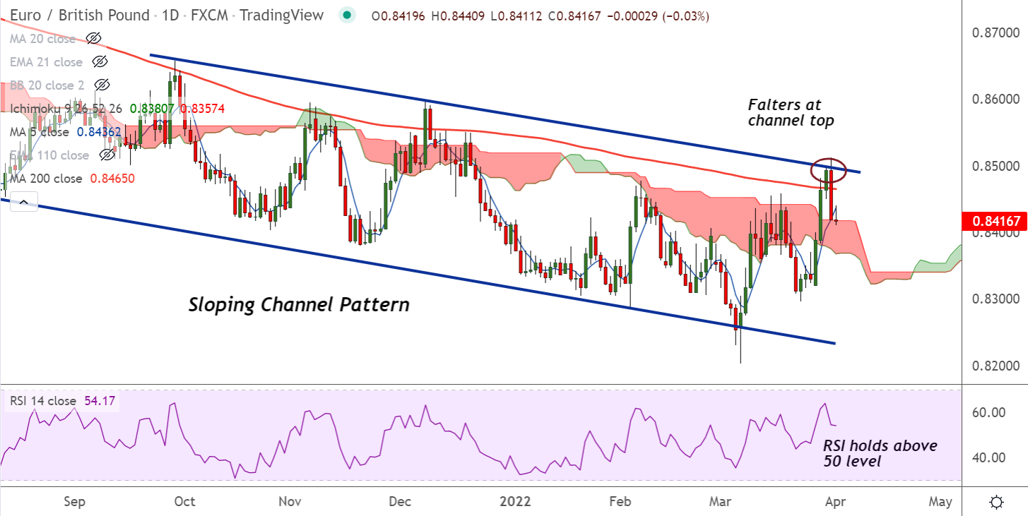 Price action hovers near cloud top and 110-EMA support at 0.8409, break below will drag the pair lower.