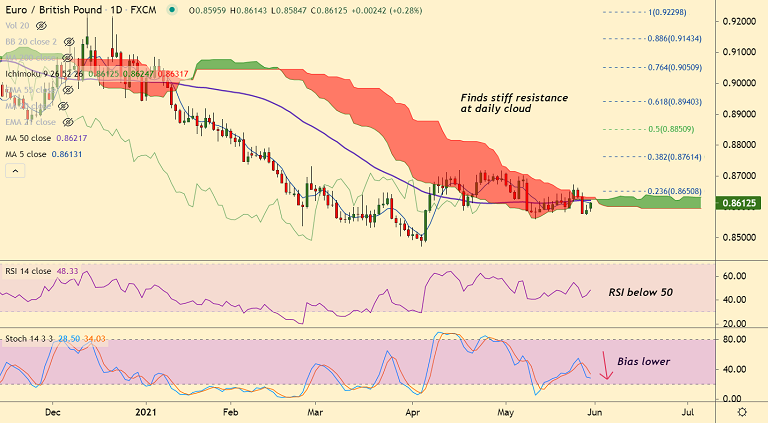 Summary: EUR/GBP trades with a neutral bias. Technical indicators do not provide a clear directional bias. The pair finds stiff resistance at daily cloud. Decisive break above required for further upside.