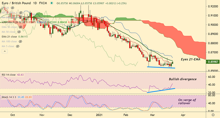 Summary: EUR/GBP set for minor upside. Reports that the European Union is set to block exports of Oxford-AstraZeneca vaccines to the UK might weigh on the British pound. A significant shortage in vaccine supplies could derail the UK government's plan to exit the current lockdown and dampen prospects for a swift economic recovery. 21-EMA is major resistance at 0.8611, break above to see further gains.