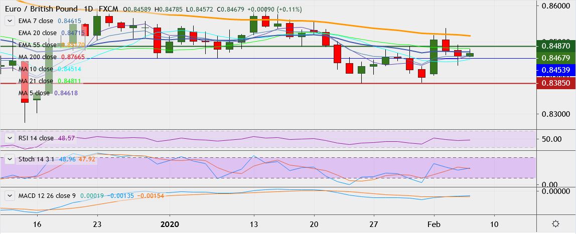 - On the downside, support is seen at 0.8452 (5-DMA), a break below could drag it till 0.8445 (10-DMA).