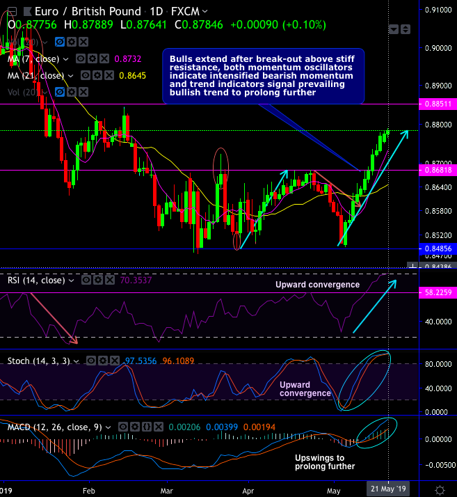 EURGBP bulls take-off the current prices above 7 & 21-DMAs upon the test of strong supports at 0.8485 levels, recently, bulls managed to break-out the stiff resistance of 0.8681 levels decisively that stimulates the previous bullish sentiments (refer daily chart).