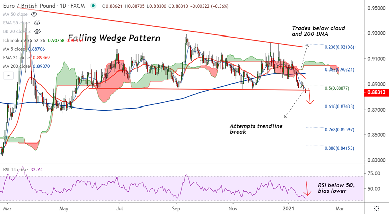 Summary: EUR/GBP trades with a strong bearish bias. Close below wedge base support and breach at 200W MA at 0.8830 will plummet prices further. Scope then for test of 61.8% Fib 0.8743.