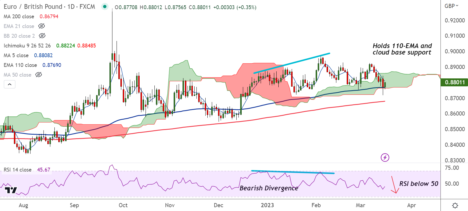 Technical Summary: EUR/GBP finds strong support at 0.8770 level. The pair trades with a bearish bias. 5-DMA is sharply lower. Momentum is bearish and volatility is high. Break below cloud will see more weakness.