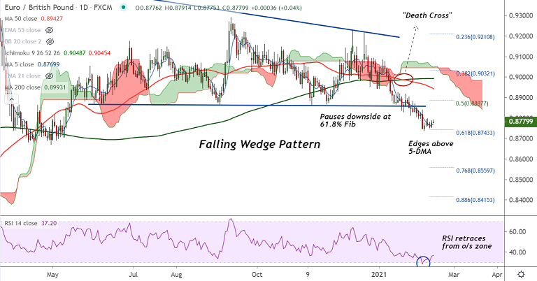 EUR/GBP trades with a major bearish bias. Recovery attempts lack traction. 'Death Cross' on the daily charts keeps bias lower.