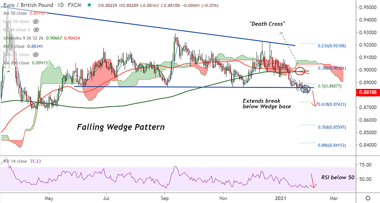 Breach below Falling Wedge pattern and confirmation of a Death Cross on the daily charts keeps bias bearish.