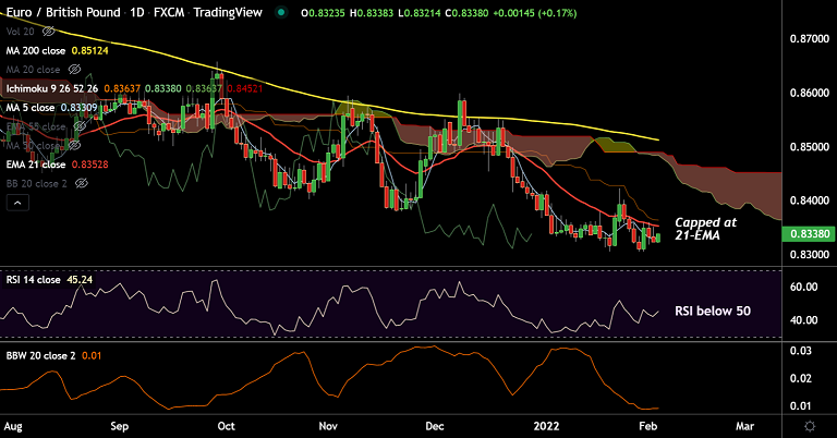 - EUR/GBP capped below 21-EMA which is stiff resistance at 0.8352