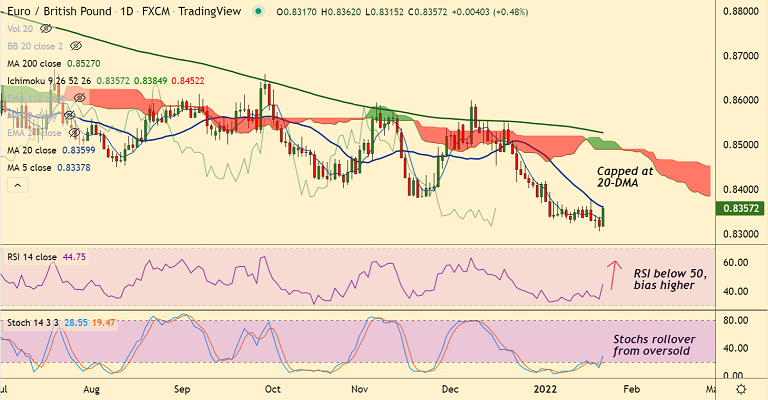 Upside in the pair remains capped at 20-DMA. Break above will see minor upside. Next immediate resistance lies at 21-EMA at 0.8369.