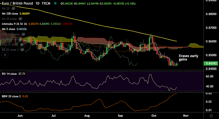 Upbeat UK PMIs acted as a tailwind for the sterling and capped gains for the cross, while the shared currency remains unaffected by the mixed flash Eurozone PMI prints for October.