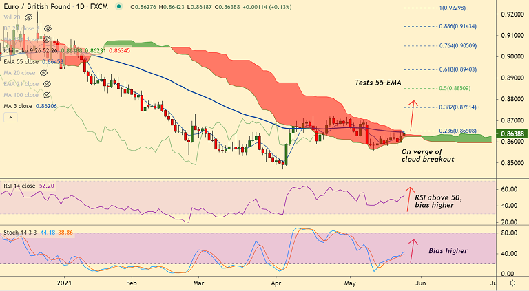 Technical bias for the pair is turning bullish. RSI has edged above 50 mark. The pair is testing 55-EMA resistance at 0.8646, decisive break above 55-EMA and daily cloud will propel the pair higher.