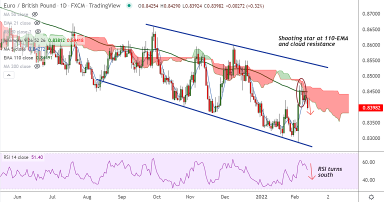 - EUR/GBP was rejected at 110-EMA and daily cloud resistance