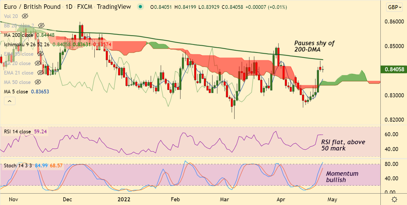 Break above 200-DMA is required for upside continuation, while breach below cloud will negate any further bullishness.